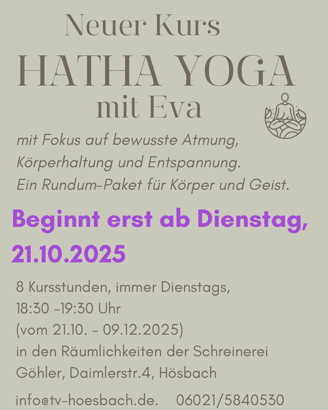 Neuer Yoga-Kurs „HATHA YOGA mit Eva“ beginnt 1 Woche später! Start nun am Dienstag, 21.10.2025, 18:30 – 19:30 Uhr