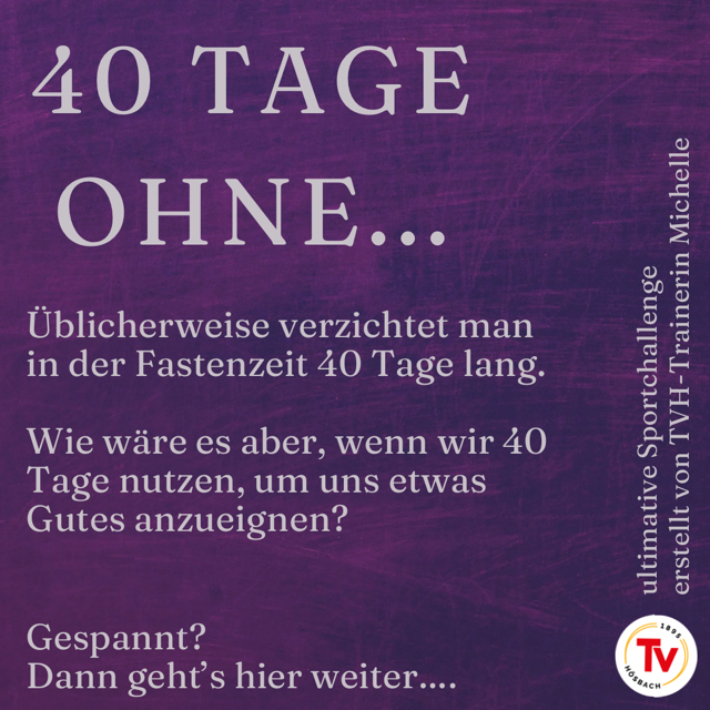 Sport Challenge in der Fastenzeit ab Aschermittwoch, 18.02.2026 Veröffentlicht am 17. Februar 202616. Februar 2026 von Andrea Lippert 40 Tage Sport Challenge https://www.tv-hoesbach.de/wp-content/uploads/2026/02/40Tage4-1.pdf