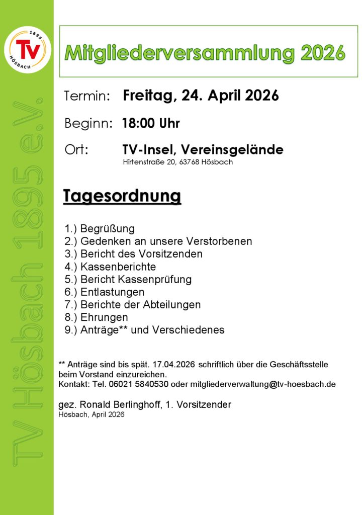 Einladung zur Jahreshauptversammlung Veröffentlicht am 9. April 202630. März 2026 von Andrea Lippert Liebe Mitglieder des Turnvereins Hösbach, hiermit ergeht herzliche Einladung zu unserer diesjährigen Jahreshauptversammlung.